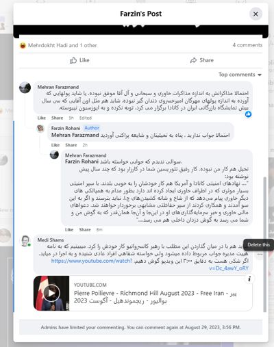 از بیست صفحه در سوشیال مدیا به اشتراک گذاشته شده مقاله در شهرما - 17 آگوست 2023 - عملکرد دوره فعلی فوروم کنگره ایرانیان مطلب همراه سانسور شد